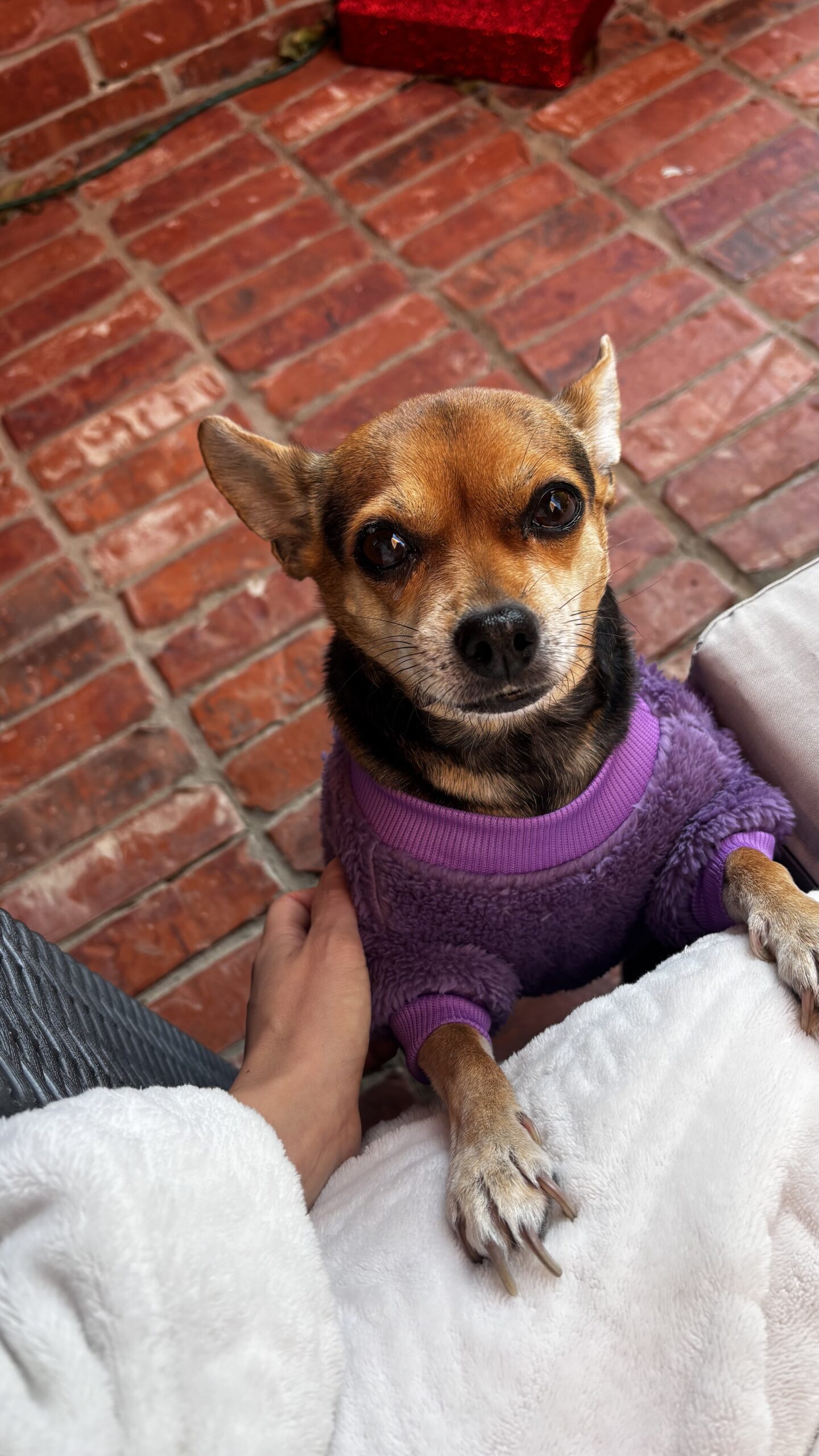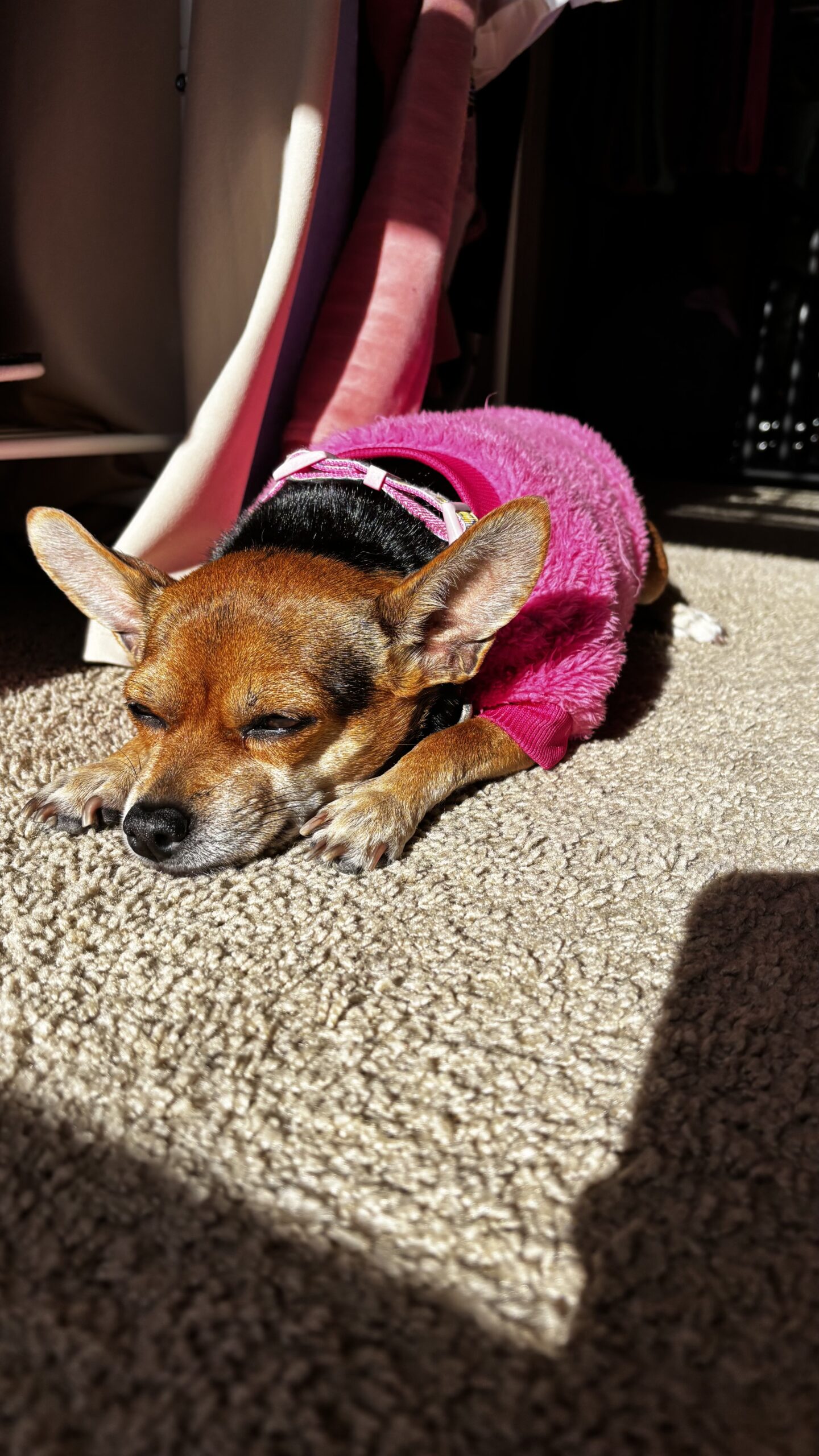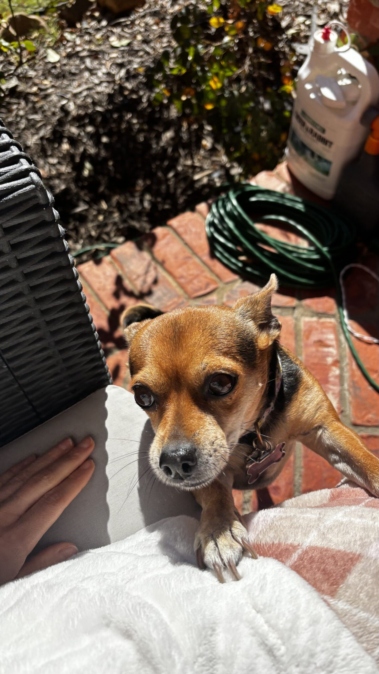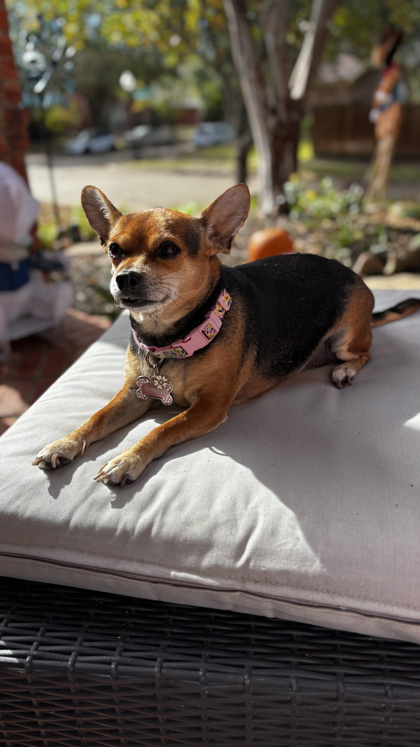 Hi, I’m Rajah — a Chipin, which means I’m a mix of Chihuahua and Miniature Doberman Pinscher. I’m about seven years old, and I’ve been stealing hearts ever since. I love cuddles, attention, and soaking up the sun ANY chance I get the chance! 😍