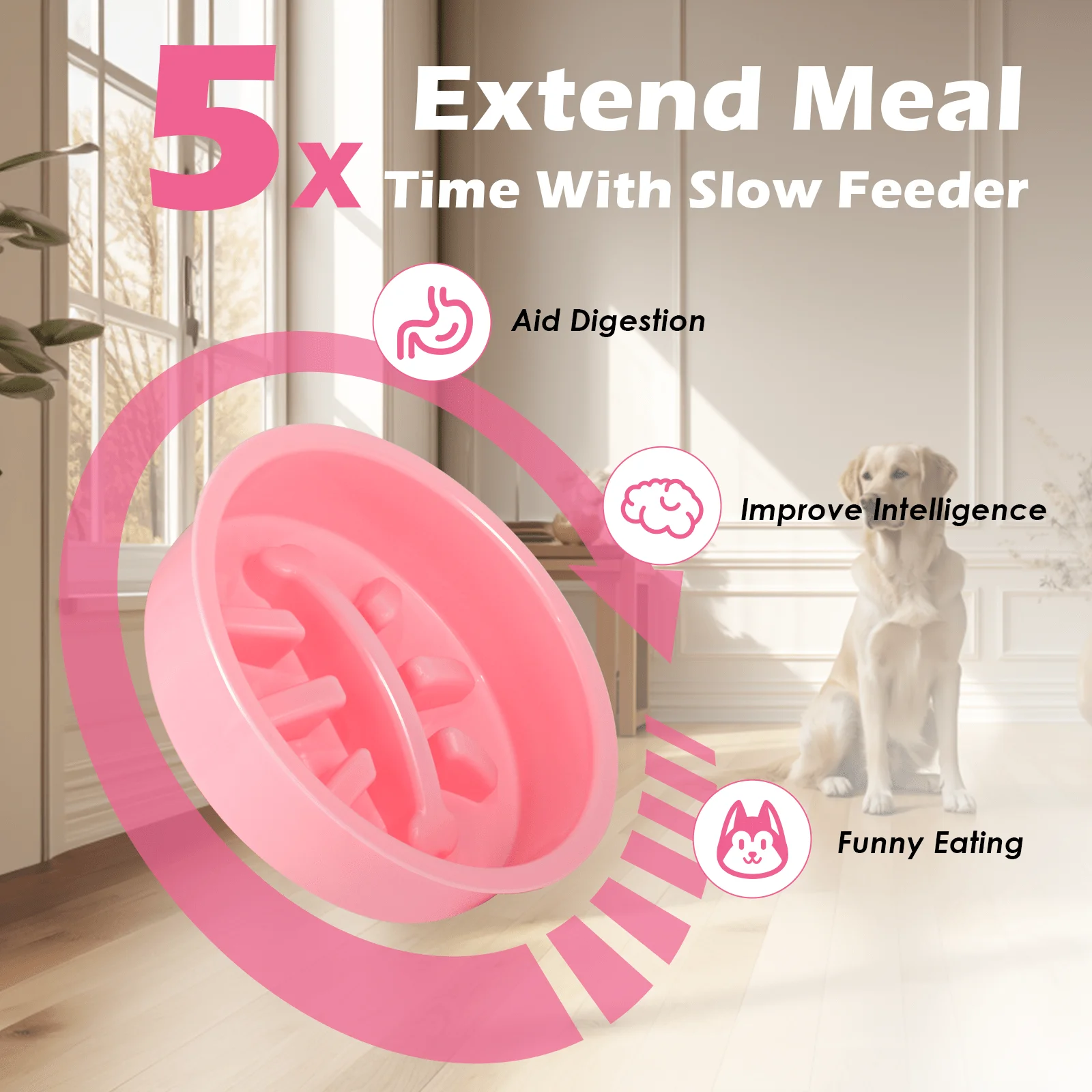 • Two stainless steel bowls + one slow-feeder bowl for versatile mealtime needs